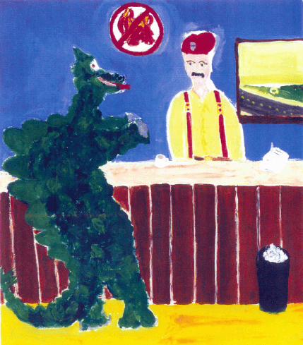 A Fireman appears behind the counter. He wears a red